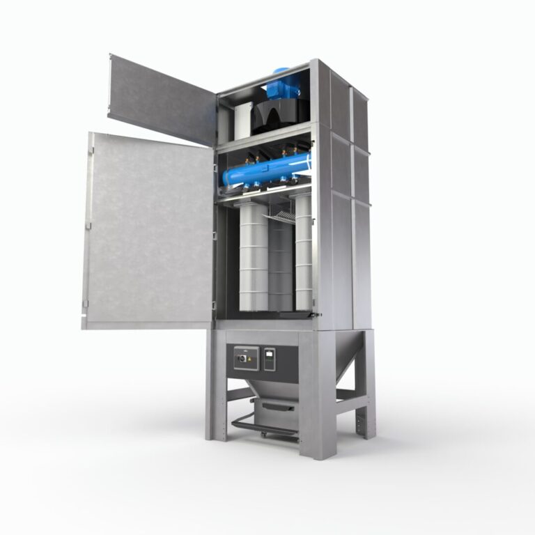 A differential pressure sensor monitors filter condition and activates cleaning only when needed. This reduces energy use and keeps filtration performance consistent. For processes requiring air recirculation, the system can be equipped with an optional HEPA filter stage.